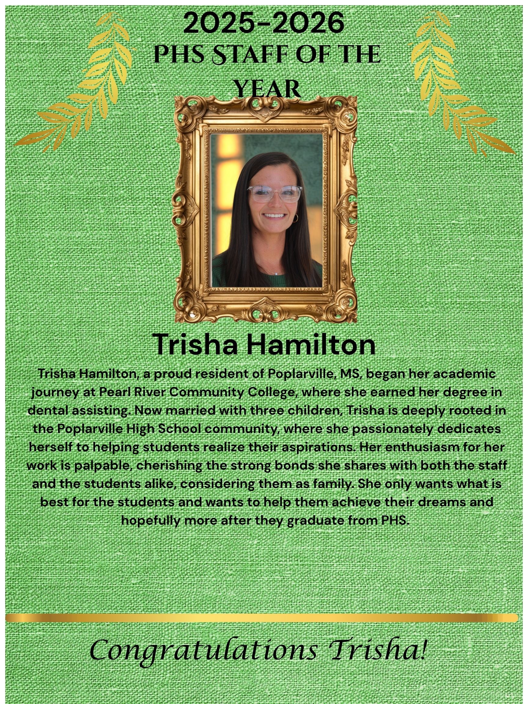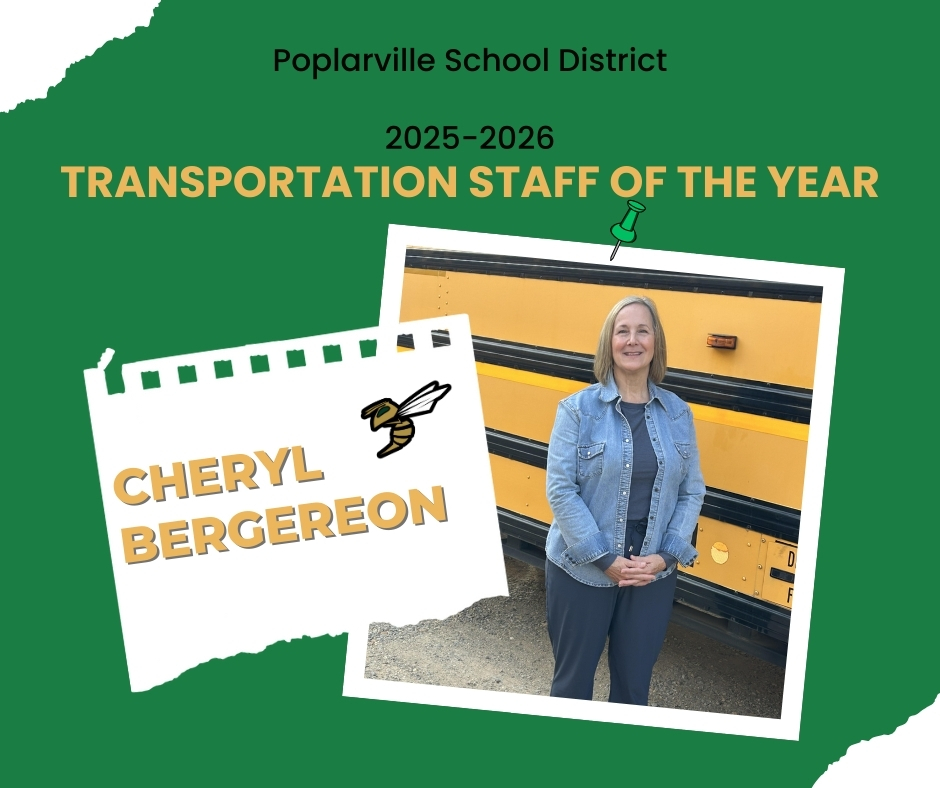 Transportation Staff Of The Year- Cheryl Bergeron The Poplarville School District is proud to recognize Mrs. Cheryl Bergeron as our