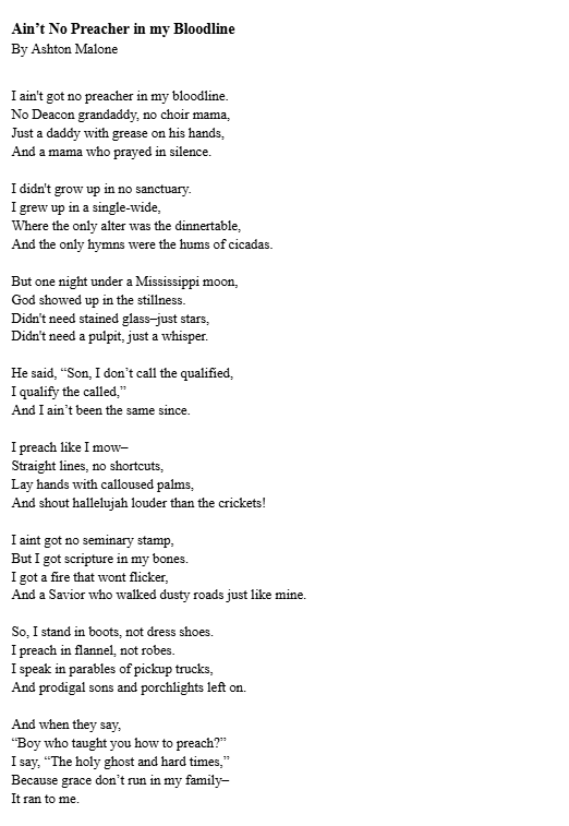 We are thrilled to announce that MSP’s very own 8th grade student, Ashton Malone, won 1st place in the National Federation of State Poetry Societies Manningham Trust Student Poetry Contest – Junior Division for his poem entitled “Ain’t No Preacher in my Bloodline.” Ashton won out of 242 entries from students across 35 states.