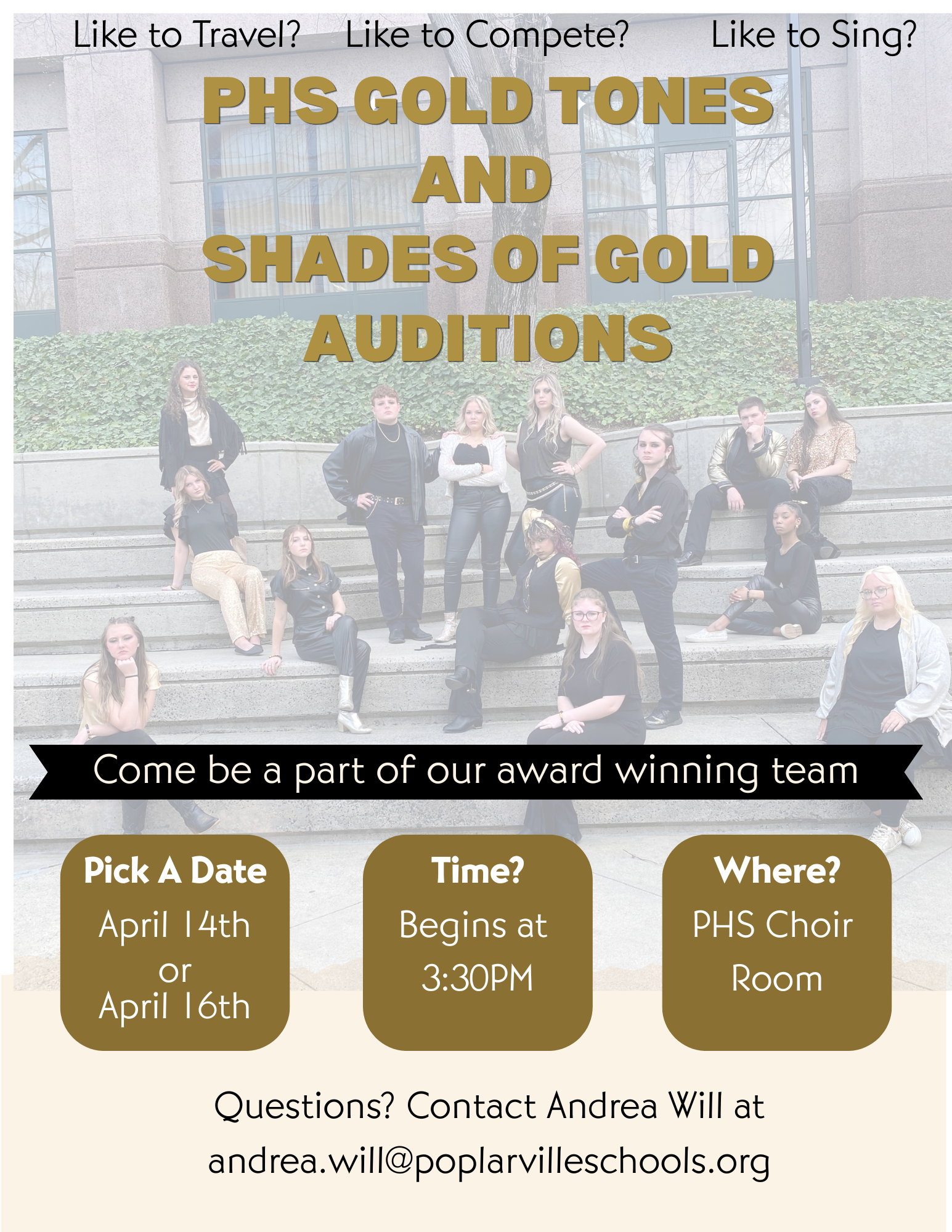 PHS Gold Tones Choir and Shades of Gold Competition A Cappella Group will hold auditions for the 2026-2027 school year on Tuesday, April 14, and Thursday, April 16, immediately following school. The auditions will be held in the PHS choir room. Please sign up using the following link.