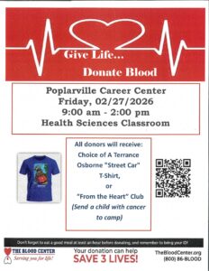 Health Sciences/HOSA will be hosting a blood drive on Friday, February 27th, from 9 a.m.-2 p.m. at the Poplarville Career Center. Please contact Todd Smith to sign up to donate.