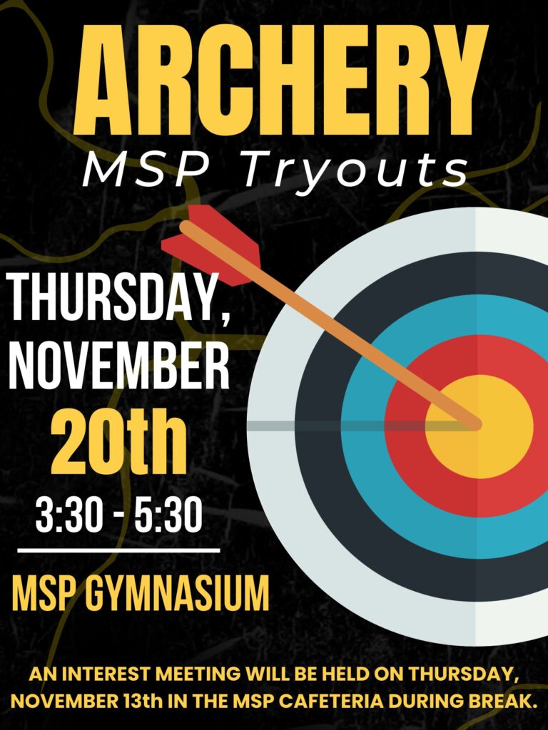 MSP Archery tryouts will be held Thursday, November 20th, from 3:30-5:30 PM in the MSP Gymnasium.