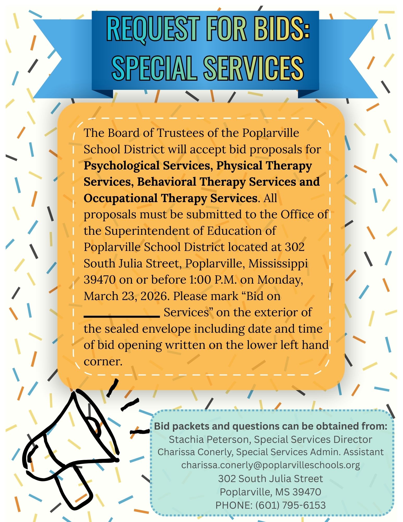 The Poplarville School District offers educational/vocational opportunities on a nondiscriminatory basis in compliance with the requirements of the following federal civil rights legislation: Title VI, Title IX, the Vocational Amendments of 1976 and 1979, Section 504 of the Rehabilitation Act of 1973, and the Individuals with Disabilities Educational Act. Further, the Poplarville School District offers equal educational and employment opportunities to all persons without regard to sex, race, religion, color, national origin, age, or disability. The district’s contact coordinator for compliance with these requirements is Stachia Peterson, Title IX Coordinator and 504 Coordinator 302 South Julia Street, Poplarville, Mississippi 39470, Phone (601) 795-6153.