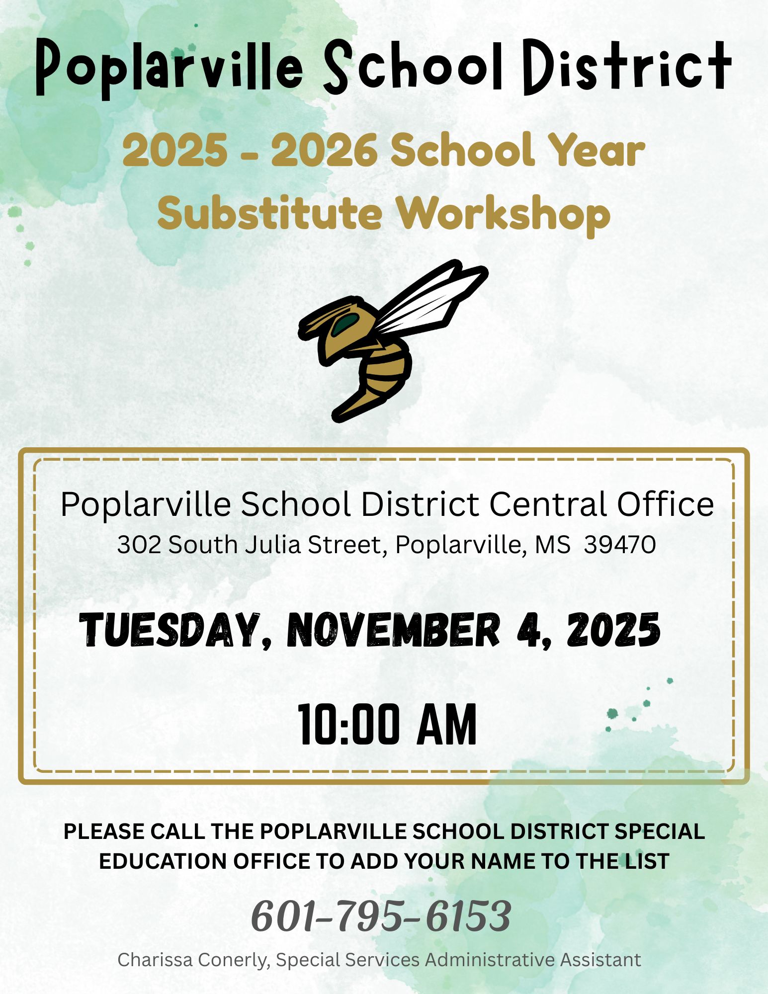 PSD Board Room 302 S Julia Street, Poplarville, MS, United StatesA Special Called Meeting of the Board of Trustees of the Poplarville Special Municipal Separate School District will be held in the PSD Central Office Board Room on Wednesday, January 29, 2025, at 8:00 am.